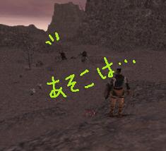 小さな崖を下った先には、獣人クゥダフが集まる焚き火があります。